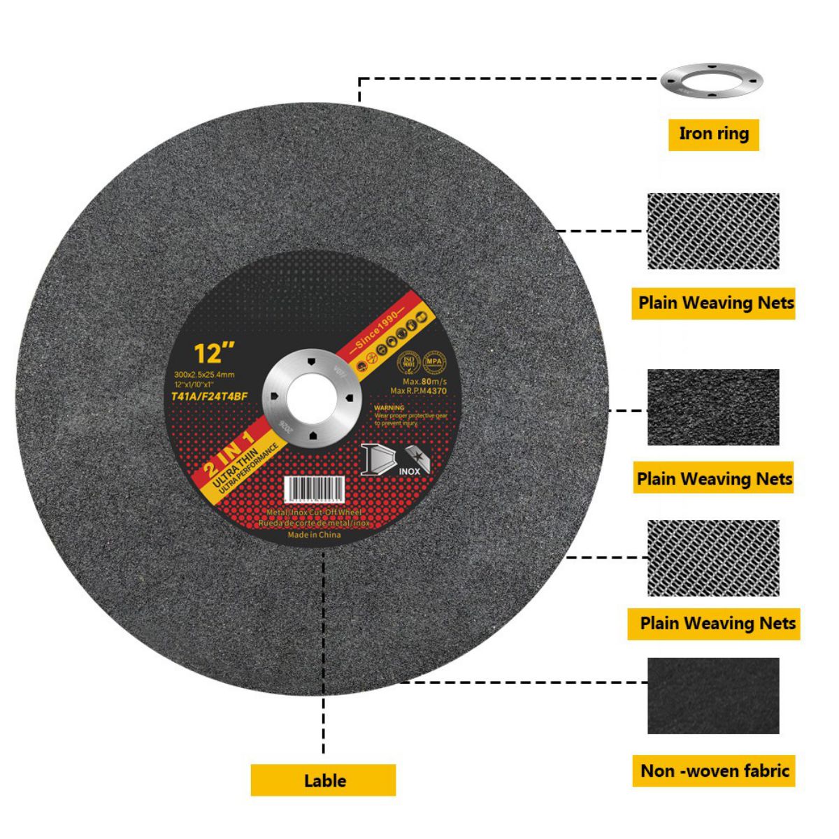Благодаря этим характеристикам наши 12-дюймовые отрезные диски отлично подходят для резки металла и соответствуют стандартам безопасности и производительности промышленных сред.