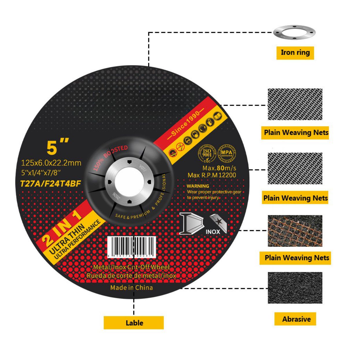 - Адаптируемость к материалу: матрица из оксида алюминия подходит для дисков для угловых шлифовальных машин по металлу из нержавеющей/углеродистой стали.